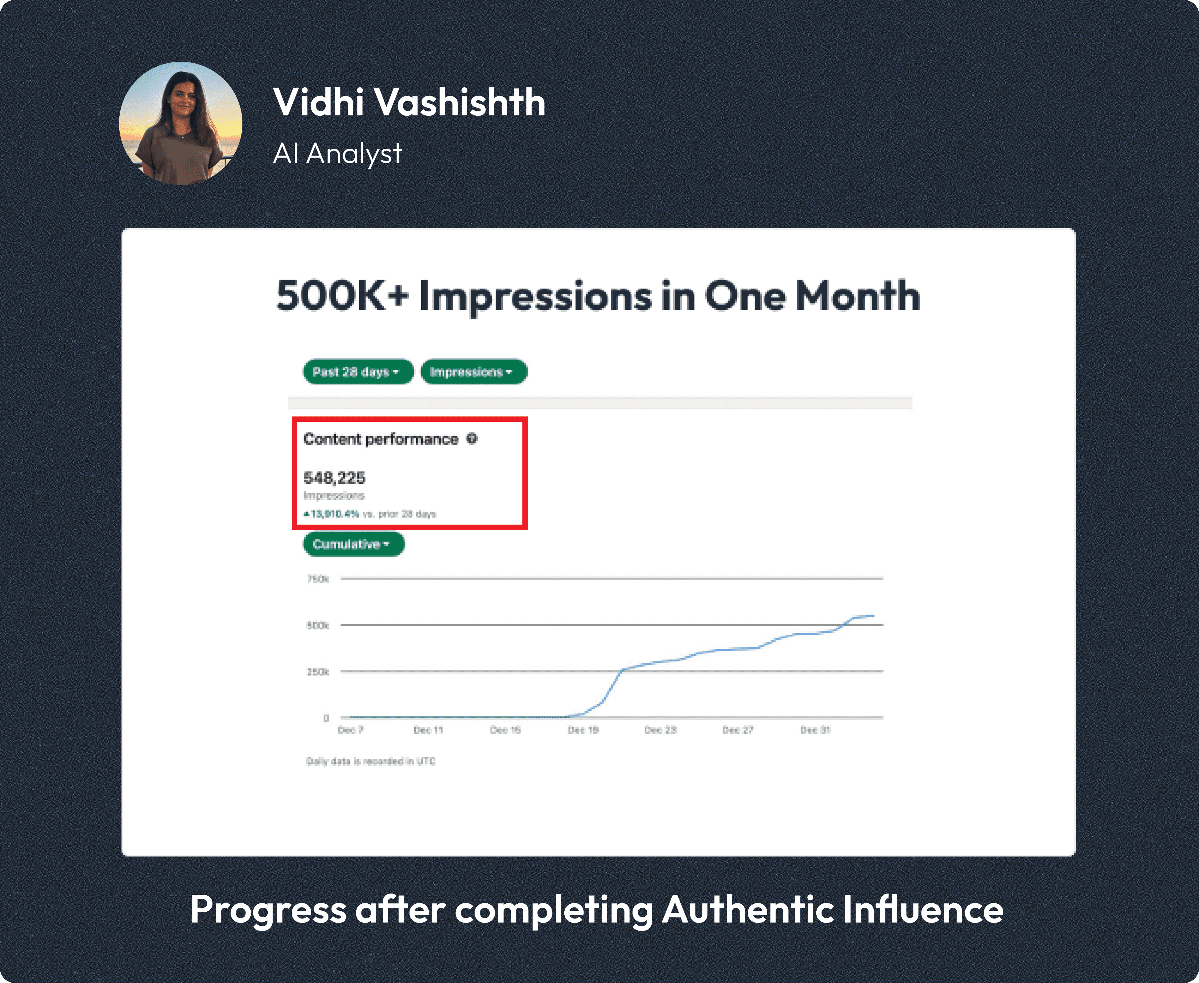 Before taking Niharikaa’s Authentic Influence course, my LinkedIn posts typically reached around 5,000 impressions — with an occasional high of 22,000. After applying her frameworks and practical techniques, one of my posts recently surpassed 200,000 impressions.